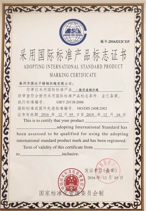 泰州市強達不銹鋼絲繩有限公司位于江蘇興化市戴南經濟開發(fā)區,公司致力于不銹鋼絲繩產品生產,立志成為“國內技術標桿型吊索具生產企業(yè)”。以此戰(zhàn)略思想指導,公司堅決貫徹“質量贏市場,管理增效益,誠信贏天下”的質量方針。以完善的服務在國內不銹鋼絲繩市場樹立良好的品牌形象。公司榮獲“江蘇省質量信得過企業(yè)。     靈活的管理機制,經驗豐富的